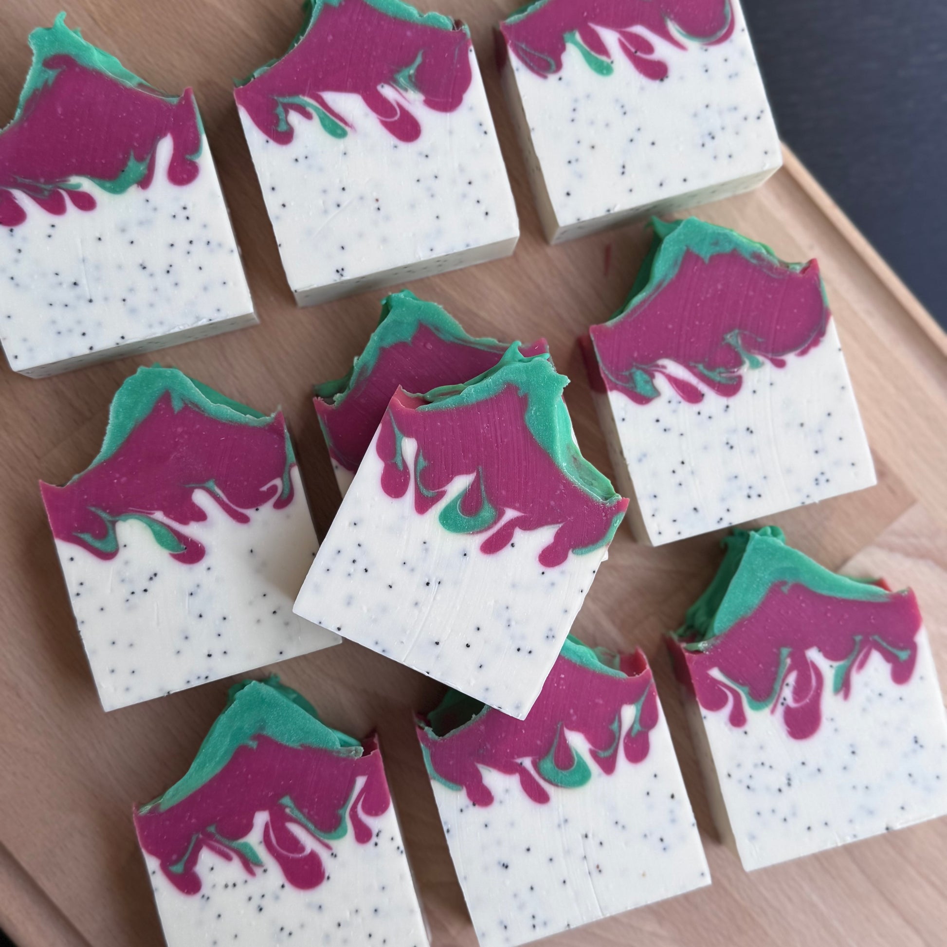 Experience handcrafted soap, playfully designed to look like a tropical dragon fruit! Brightly coloured with cosmetic grade mica. Poppyseeds have been added for design plus exfoliation.