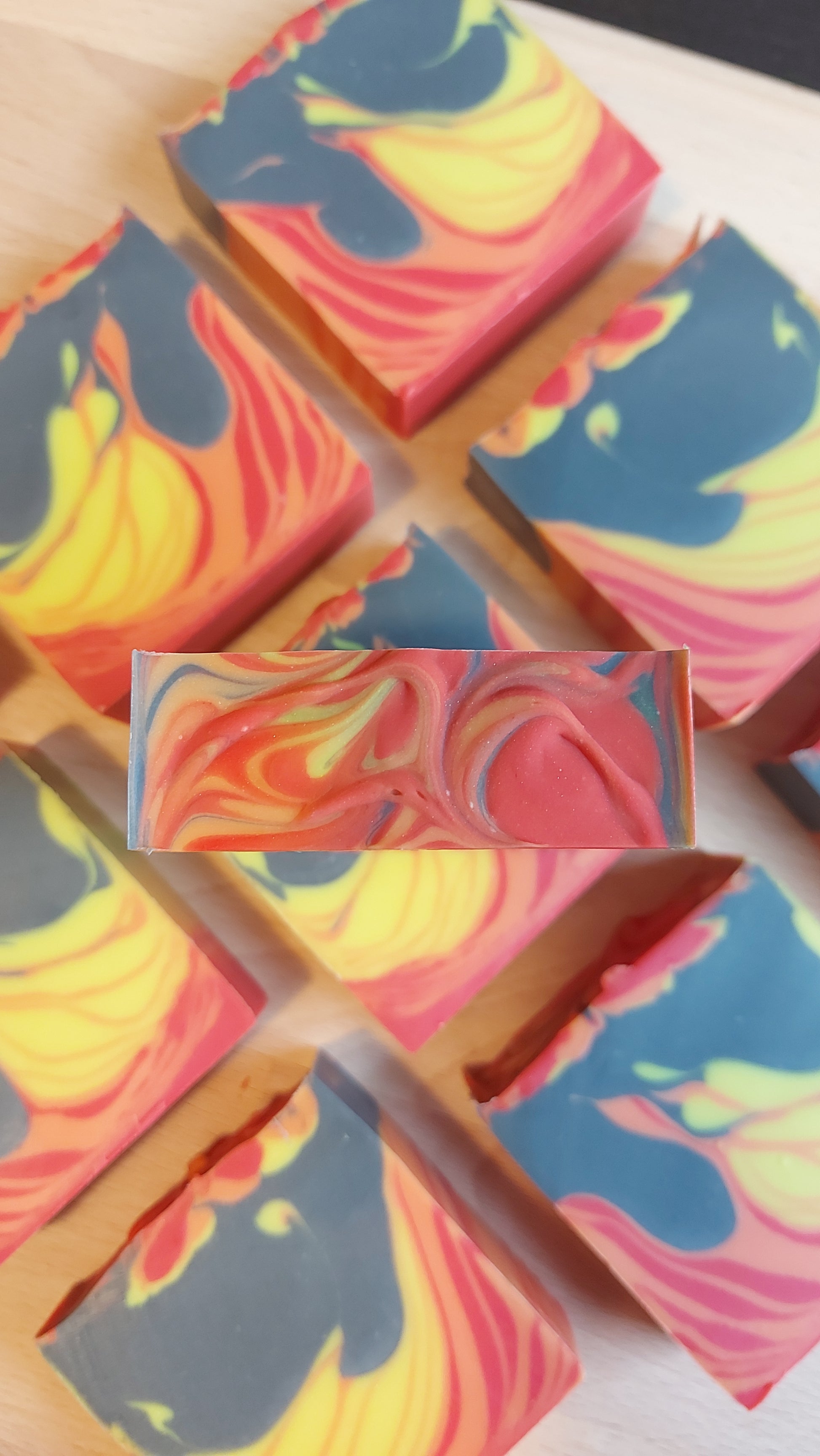 Clean up while enjoying the rich and cozy aroma of a crackling fire. Playfully designed with a lick of flame on every bar. May be loved by Steven King or camping enthusiasts.