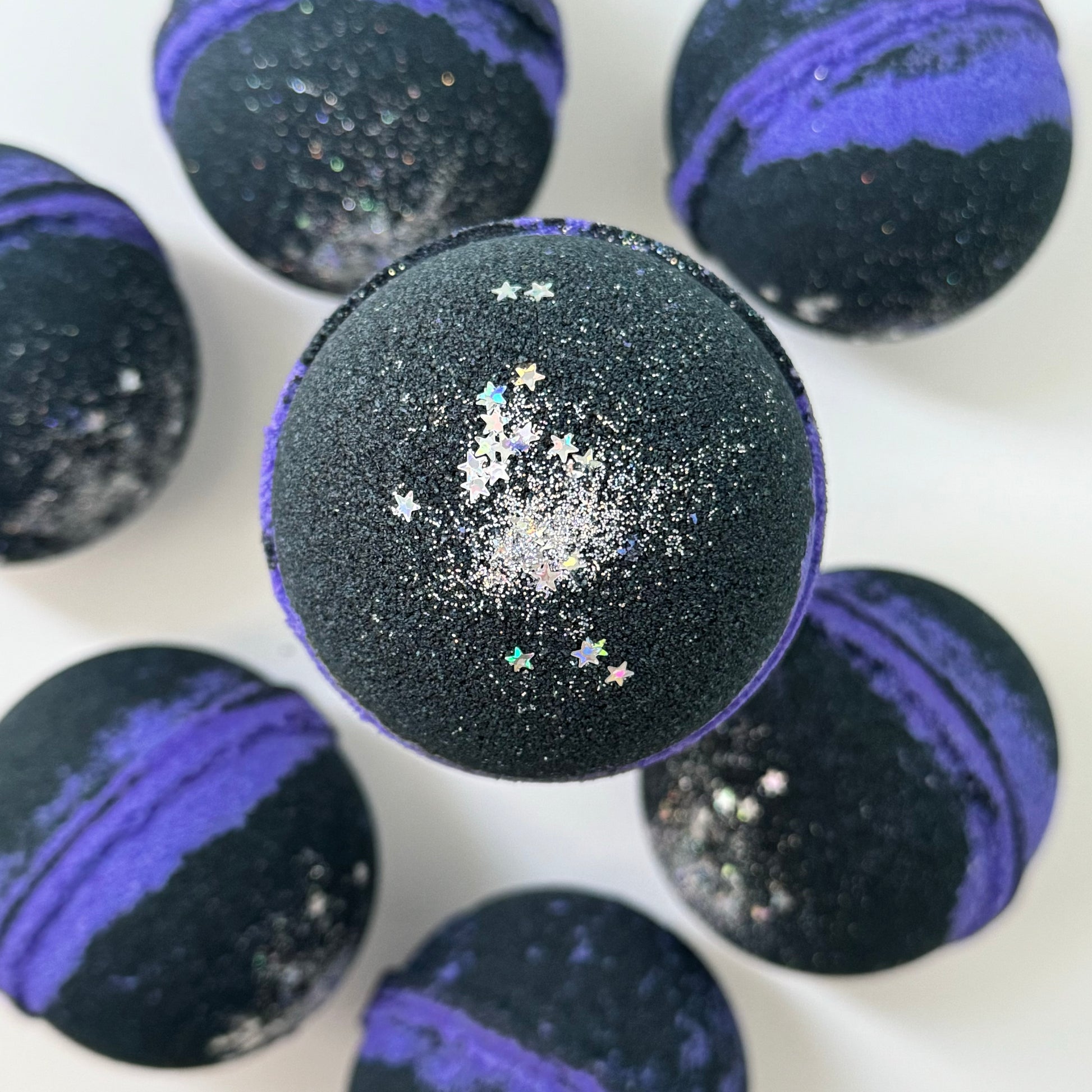 Let this bath bomb create the deep inky black of the unknown Galaxy in your tub. EcoGlitter (water safe), adds a little star sparkle to your soak.