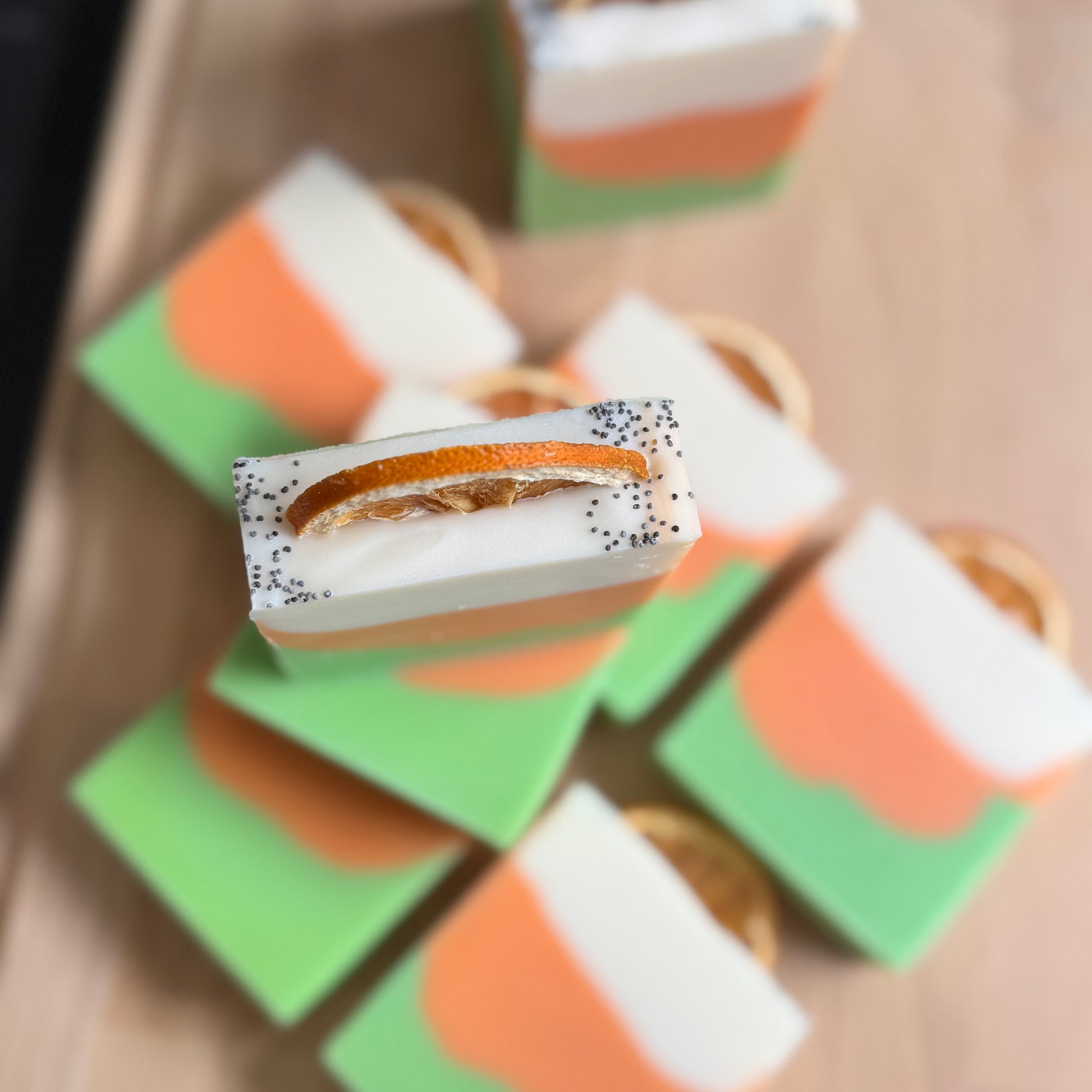 Ingredients: Sodium Sunflowerate, Sodium Cocoate, Sodium Palmate, glycerin, Sodium Castorate, parfum, Sodium Citrate, CI 77019, CI 77891, CI 77861, CI 77491, CI 77288, orange slice, poppy seeds.